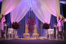 "Pinks, purples, & raspberry!" said Sonia with excitement when we asked her what colors she envisioned for her wedding. "I want the cermony to have a dreamy feel". This was an exciting color palette for us! However, the challenge was how do you balance all these vibrant colors while also keeping that elegant dreamy feel for the ceremony. We decided to go with soft white fabrics and bringing in these colors as accents through flowers & lighting. The mandap fabric was kept sheer and the aisle was adorned with lots of candles giving it that 'Oh so Dreamy' ambiance. The flower arrangements were made with shades of pinks, purples, & raspberry. The lighting was kept in pink blush tones to bring it all together...